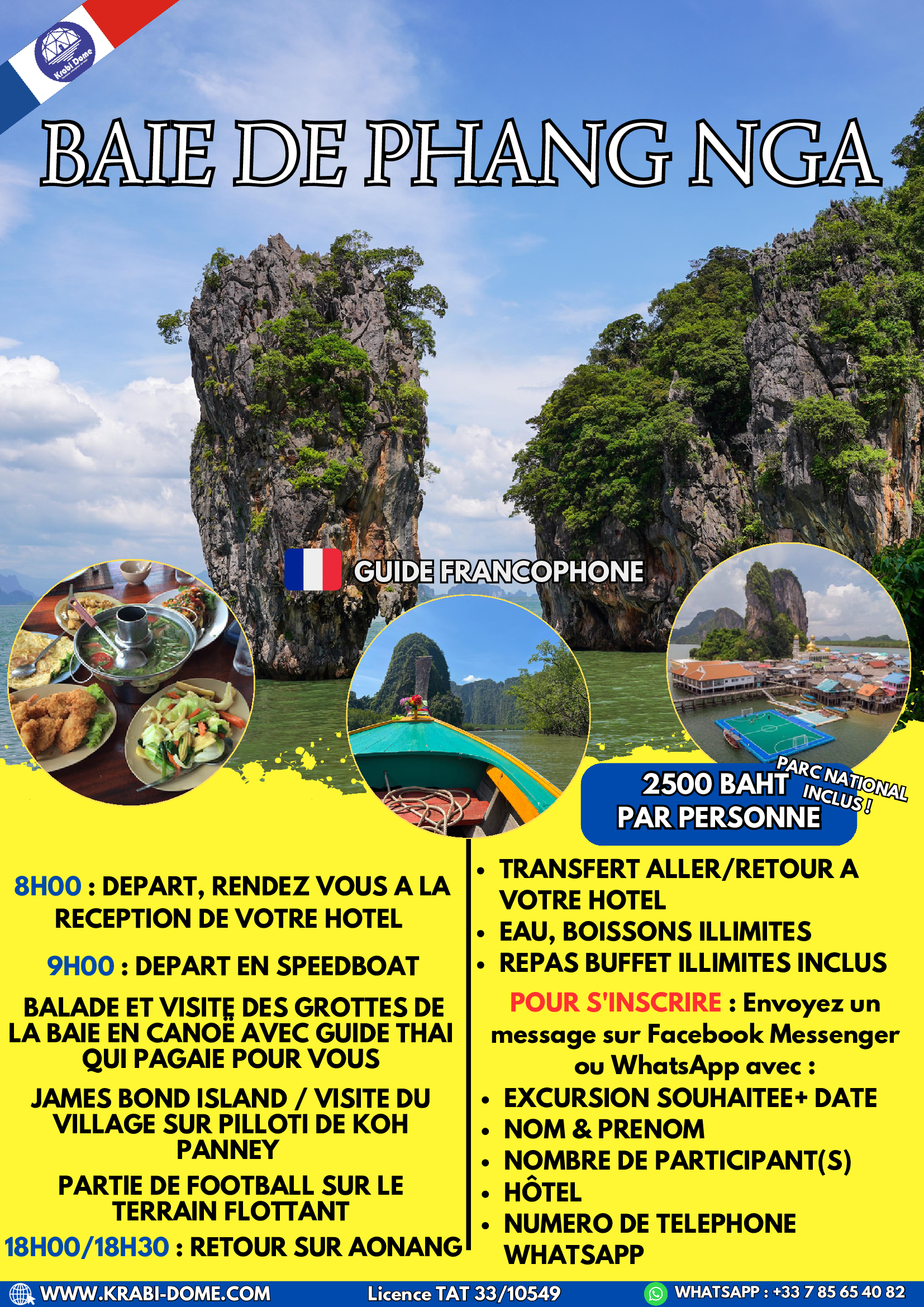 Partez pour une journée inoubliable avec cette excursion Baie de Phang Nga et la célèbre James Bond Island opérée par Krabi Dome. Depuis Krabi, découvrez les paysages spectaculaires de la baie, ses grottes, son village flottant, Koh Panyee, et vivez une aventure unique en speedboat avec guide francophone.